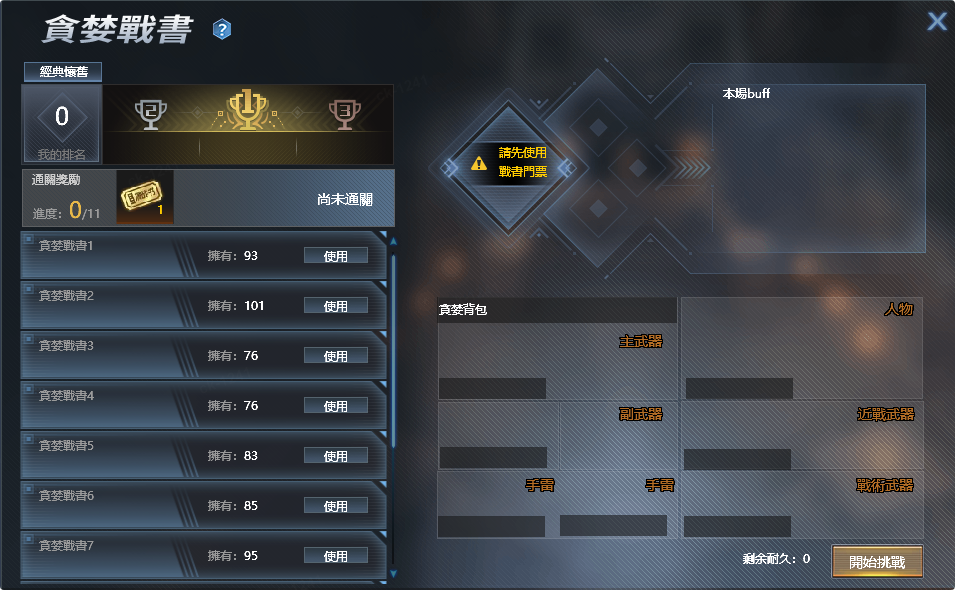 玩家可在大廳介面,消耗挑戰次數獲得相應難度的3次挑戰耐久;